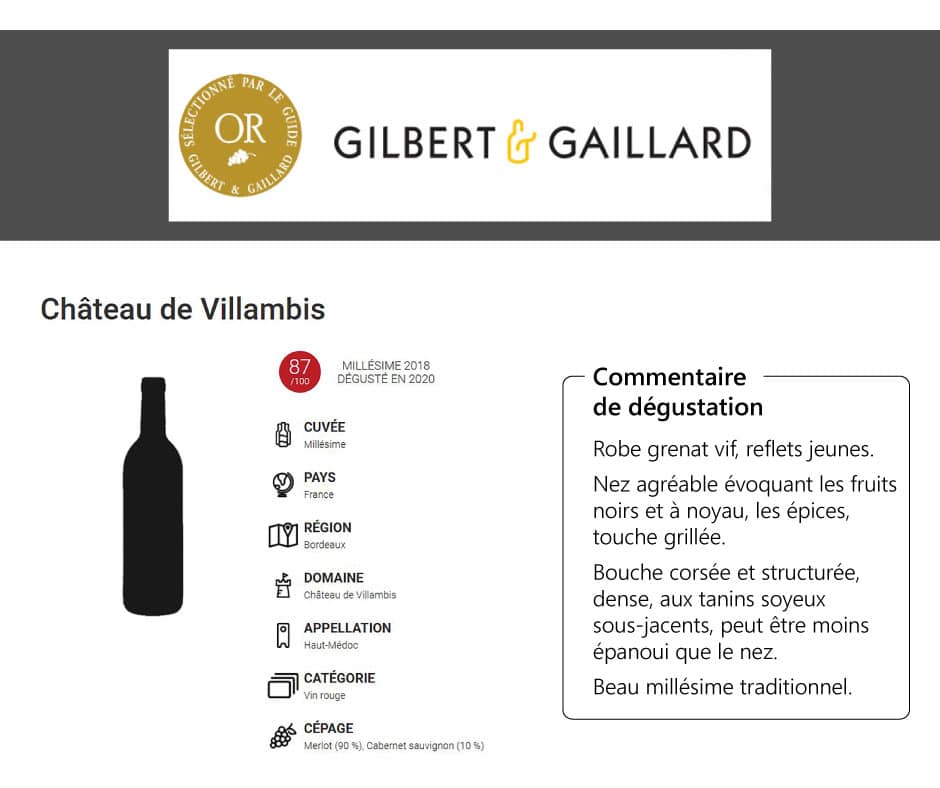 Avec une note de 86/100 pour le millésime 2017 et 87/100 pour le millésime 2018, le vin Château de Villambis est qualifié par le guide Gilbert & Gaillard comme « Vin de très bon niveau, dont nous avons apprécié la typicité et la personnalité ».