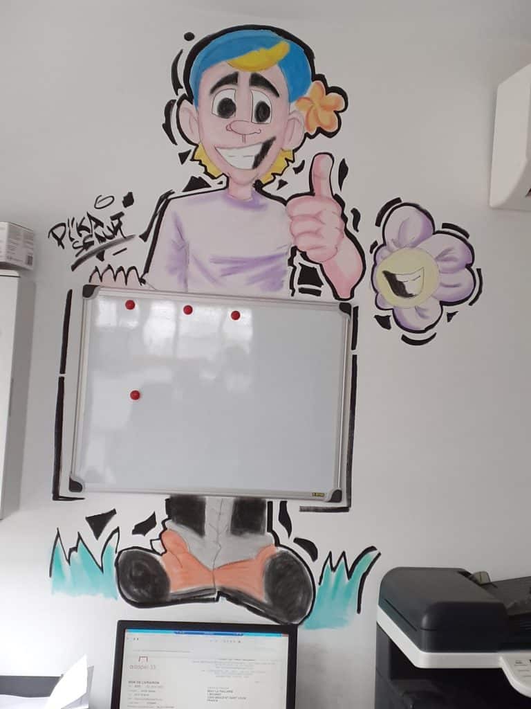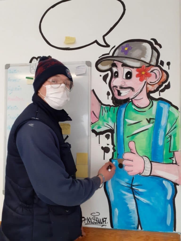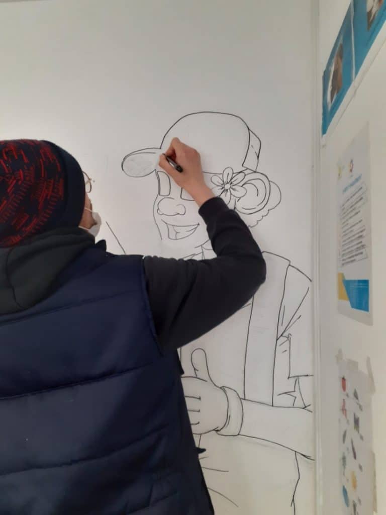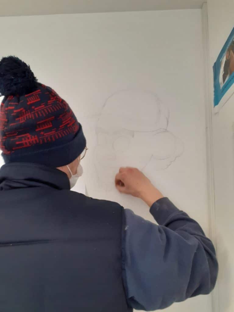 «J’ai fait des dessins pour décorer le bureau. Chantal a demandé à M. Populus pour que je dessine sur le mur et vu avec Sophie. J’ai apprécié dessiner car j’aime beaucoup ce domaine. C’est une très belle expérience pour moi. Je suis content que ça plaise à l’équipe. Ils me disent « jolis dessins ». S’il y a d’autres occasions, je souhaiterais dessiner pour d’autre Atelier. » Gaëtan