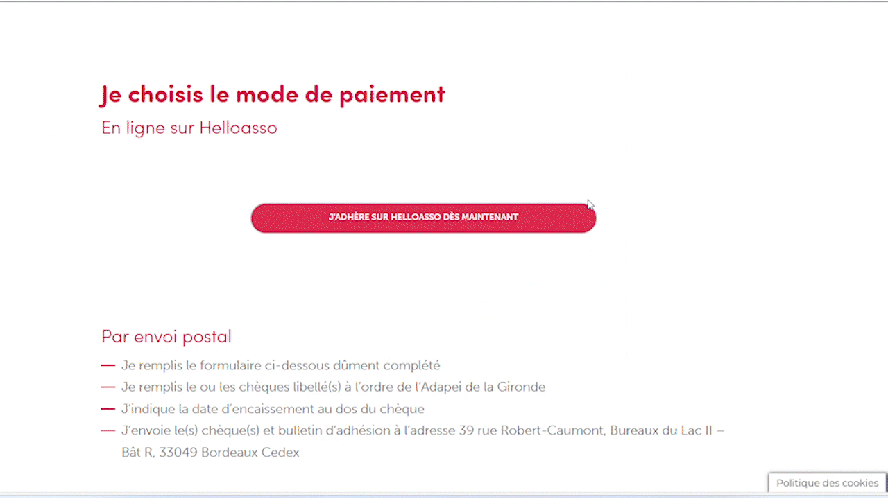 - J’envoie le(s) chèque(s) et bulletin d’adhésion à l’adresse 39 rue Robert-Caumont, Bureaux du Lac II – Bât R, 33049 Bordeaux Cedex