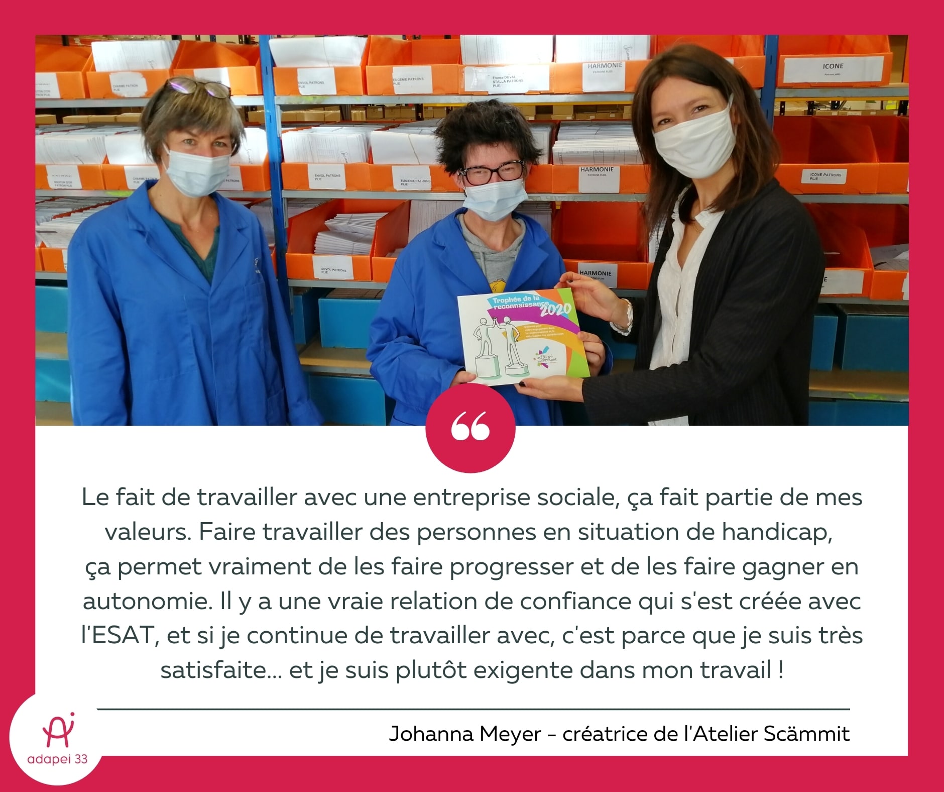Dans la cadre de l’événement Compétence Day, organisé ce jour par le Réseau Différent & Compétent, dans lequel l’Adapei33 est fortement engagé, Jean-Baptiste Fauroux, Directeur général, accompagné par Marie Leroi, ouvrière de production à l’ESAT Pessac Magellan, ont remis le Trophée de la Reconnaissance 2020 à Johanna Meyer, créatrice de l’Atelier Scämmit.