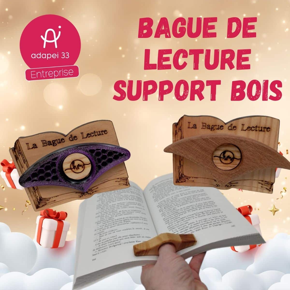 Bague de lecture en PLA (plastique biosourcé à base d’amidon de Maïs) ou en bois, présentée sur un support bois en forme de livre. Un accessoire pratique, décoratif et respectueux de l’environnement, pour maintenir vos pages ouvertes et accompagner agréablement chaque moment de lecture.