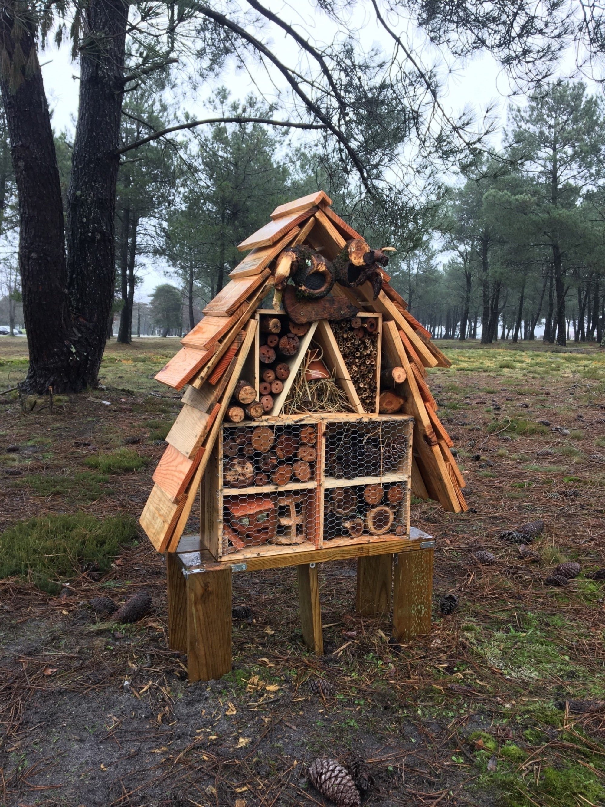 L‘hôtel à insectes a été construit par les ouvriers de l’équipe Espaces Verts durant les temps de soutien, à partir de matériaux de récupération, provenant de supermarchés (caisses en bois), de la menuiserie et des déchets verts pris sur le Site. C’est un moyen naturel pour préserver l’écosystème, la biodiversité et les insectes.