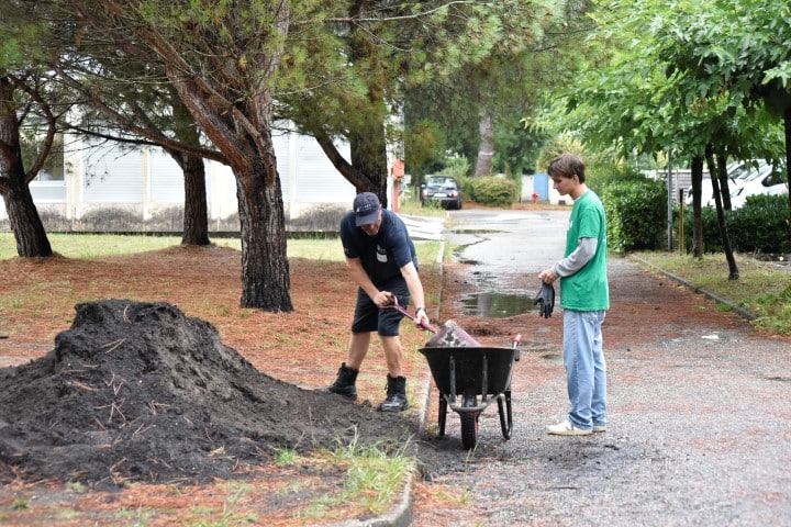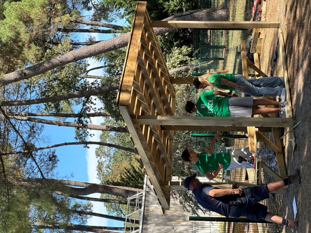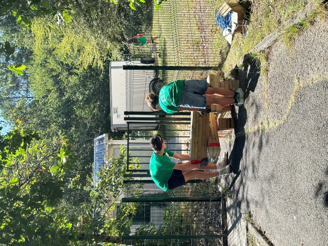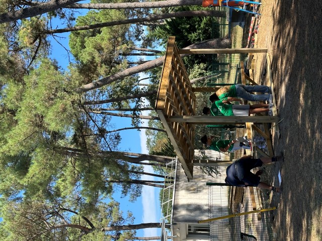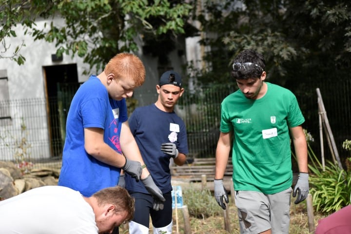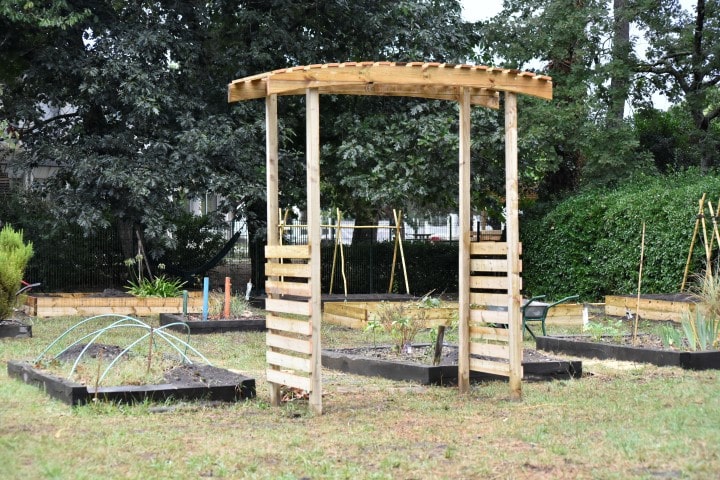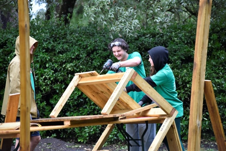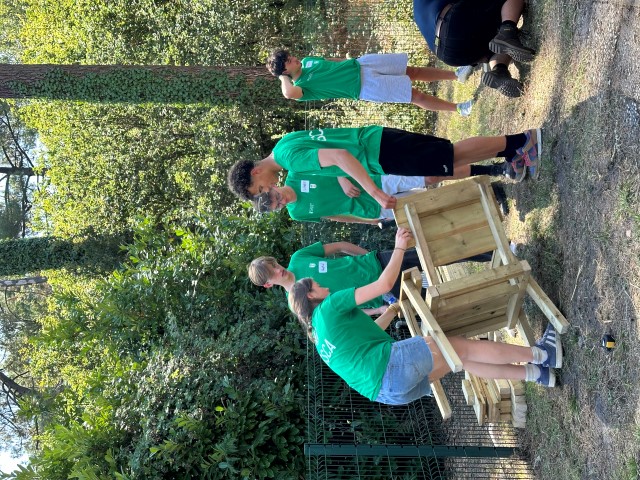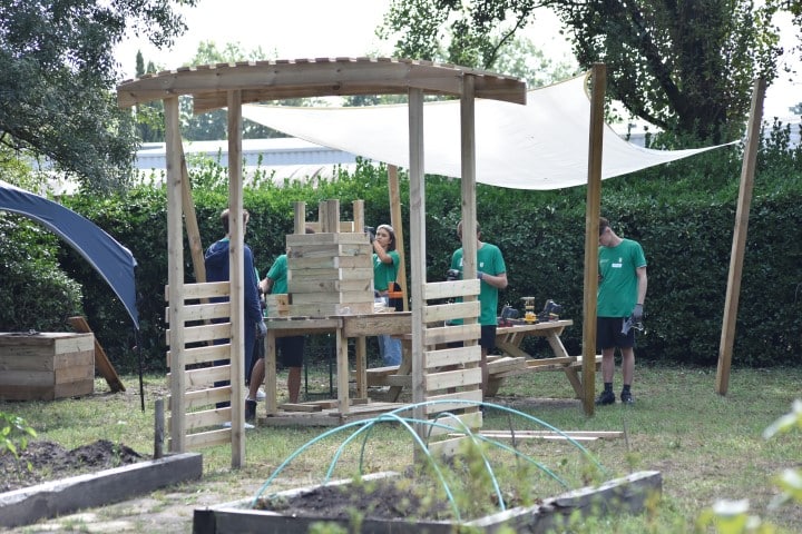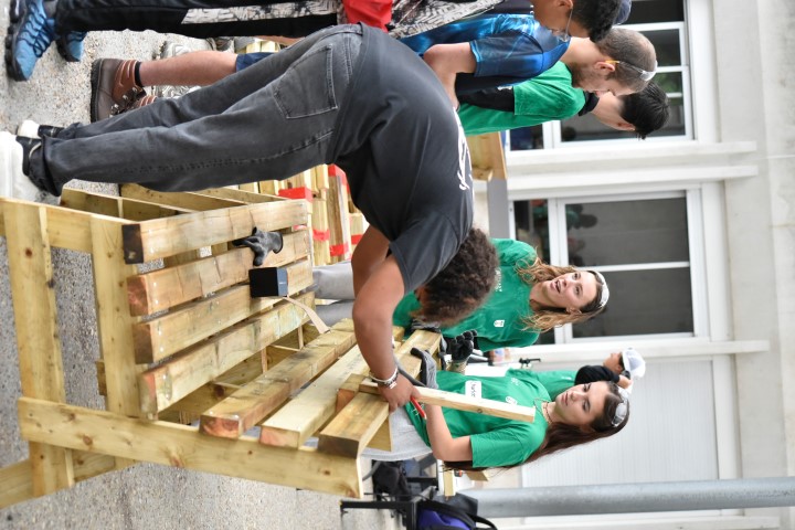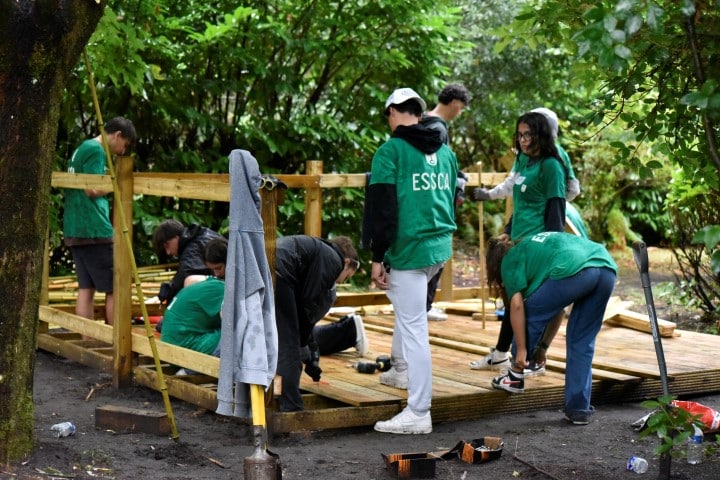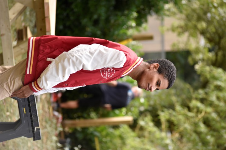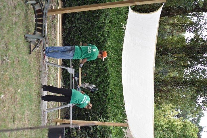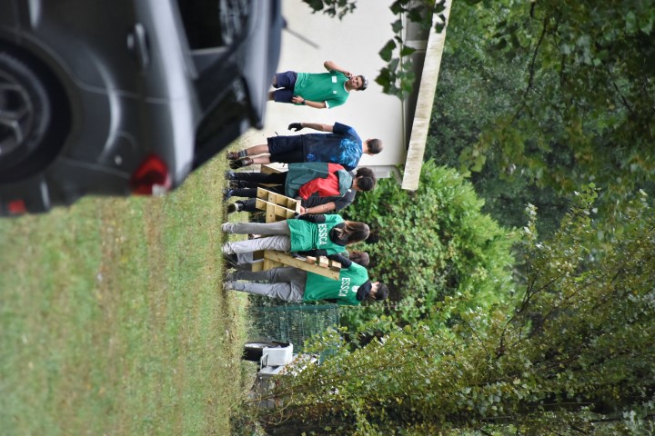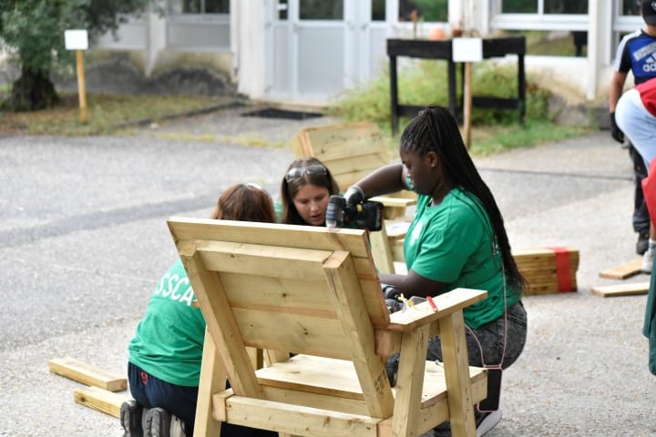 Rapidement et grâce à l’entrain des étudiants, les premières constructions en bois se prenaient forme : des bancs abrités, un bac à sable, une pergola… un bon début pour des jeunes ultra efficace et remplis de bonne humeur !
