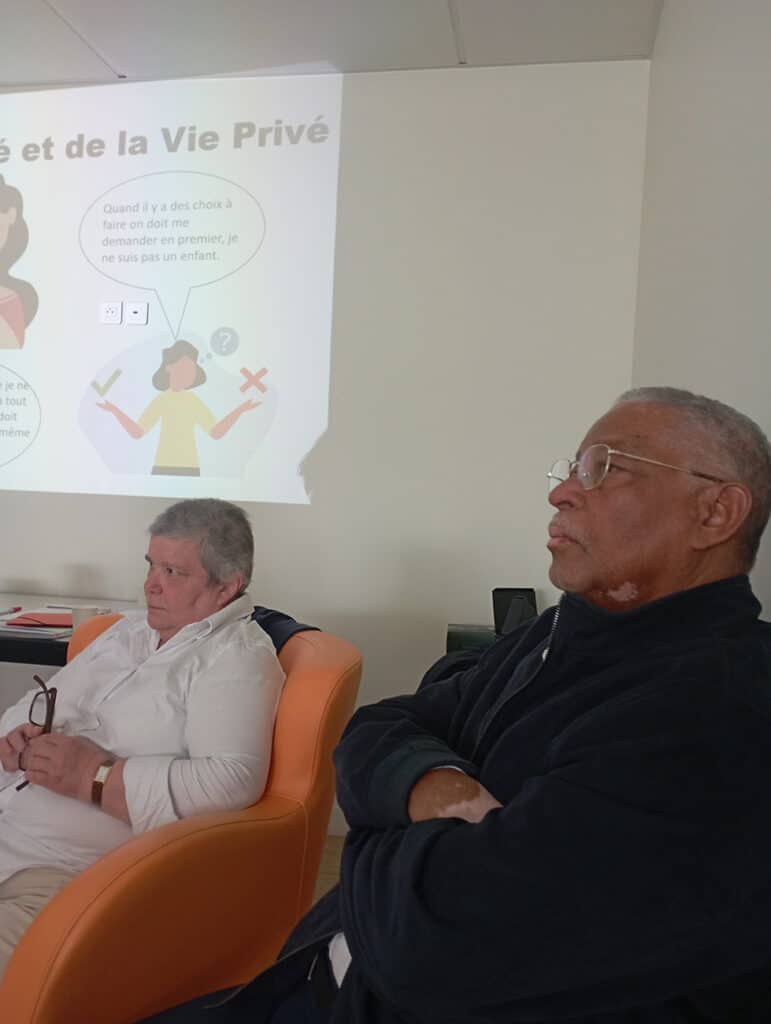 Ces discussions, nourries par des exemples concrets, ont permis de mettre en lumière des thématiques essentielles : la liberté de sortir de l’établissement, la vie affective et de couple, la parentalité, le consentement ou encore la notion de vulnérabilité. Frantz Néblai a complété ces échanges en présentant le rôle et les missions du Défenseur des droits, ainsi que les démarches possibles pour faire valoir ses droits.