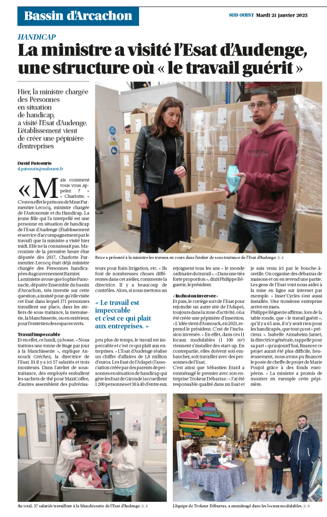 Le lundi 20 janvier, l’ESAT Adapei 33 d’Audenge a eu l’honneur d’accueillir Madame Charlotte Parmentier-Lecocq, Ministre déléguée auprès de la Ministre du Travail, de la Santé, de la Solidarité et des Familles, chargée de l’Autonomie et du Handicap. Cette visite officielle, organisée à l’initiative de Madame la Députée Sophie Panonacle, a permis de mettre en valeur les initiatives innovantes de l’Adapei 33 en matière d’inclusion et d’accompagnement des personnes en situation de handicap.
