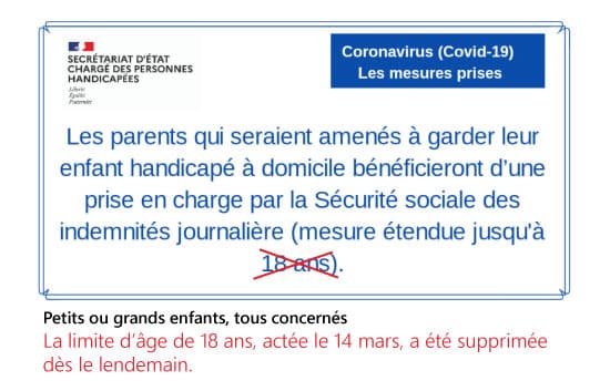 Tout parent contraint de s’arrêter de travailler pour s’occuper de son enfant handicapé durant l’épidémie de coronavirus percevra des indemnités journalières quel que soit l’âge de celui-ci. Même s’il a 35 ou 40 ans. La limite, initialement fixée à 18 ans en cas de handicap contre 16 ans dans le droit commun, est donc supprimée.